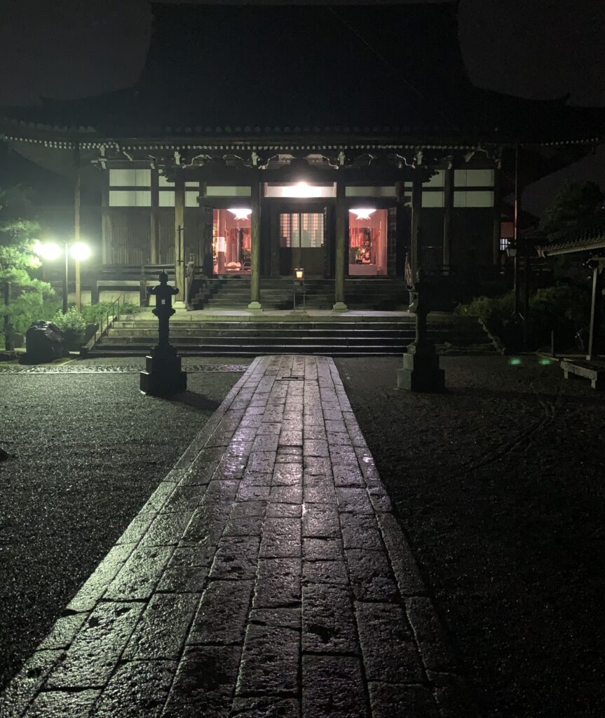 早朝(真夜中)2時30分頃です。この後、釣り鐘を衝くと近隣のお檀家様がご先祖様を迎えにお寺に来られます。その後、お盆の棚経に参らせていただきます。今年の棚経参りは豪雨に泣かされました。涼しかったのはよかったのですが、、、
