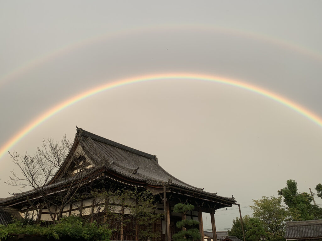 お盆を過ぎたある日の夕方です。雨は降っていましたがきれいに虹がかかってました。しかも二重に。